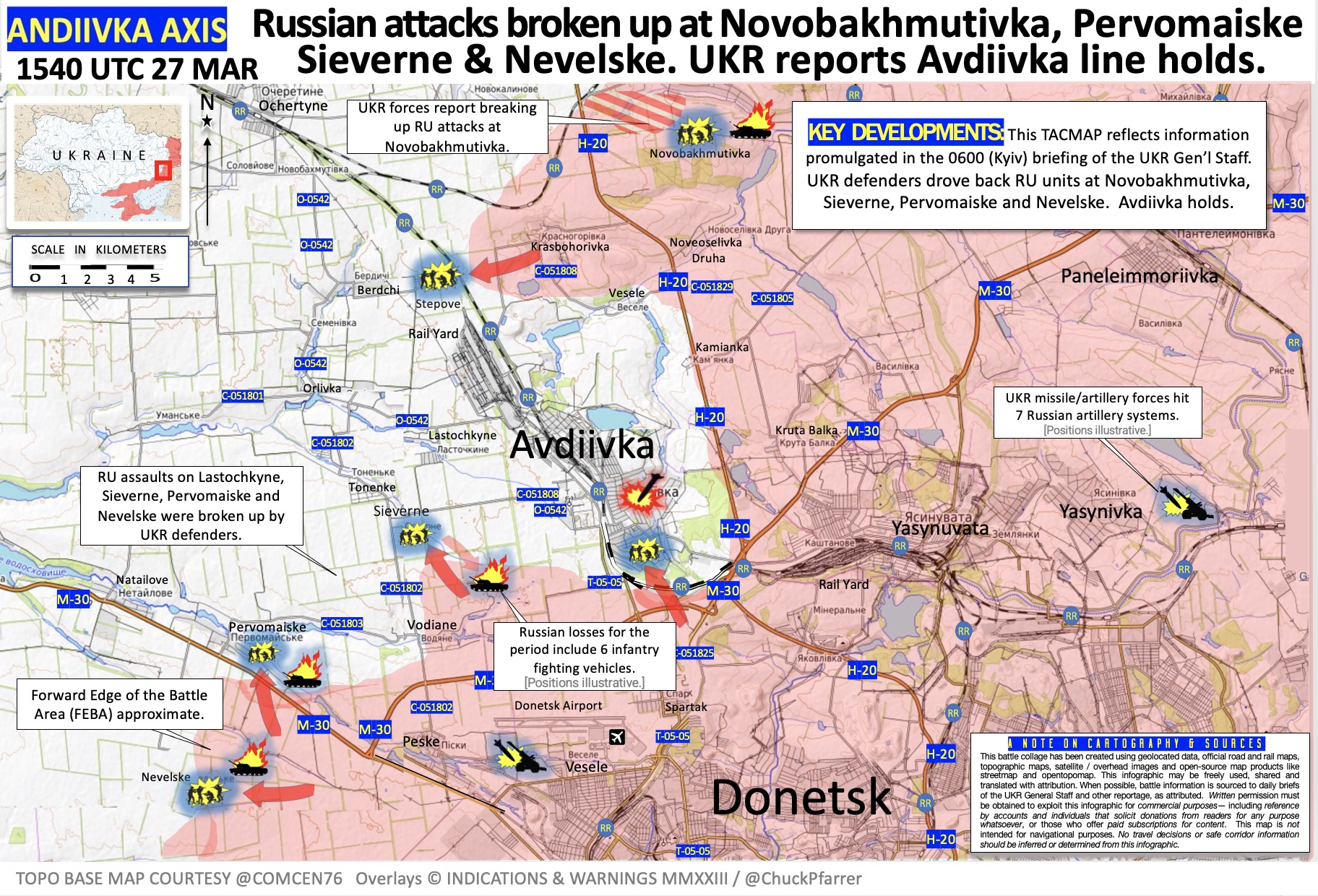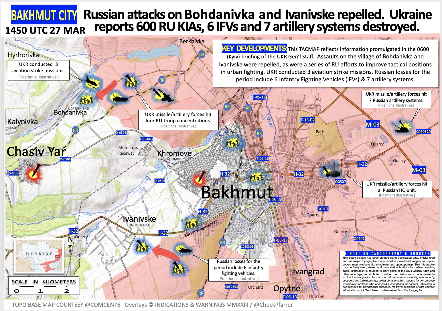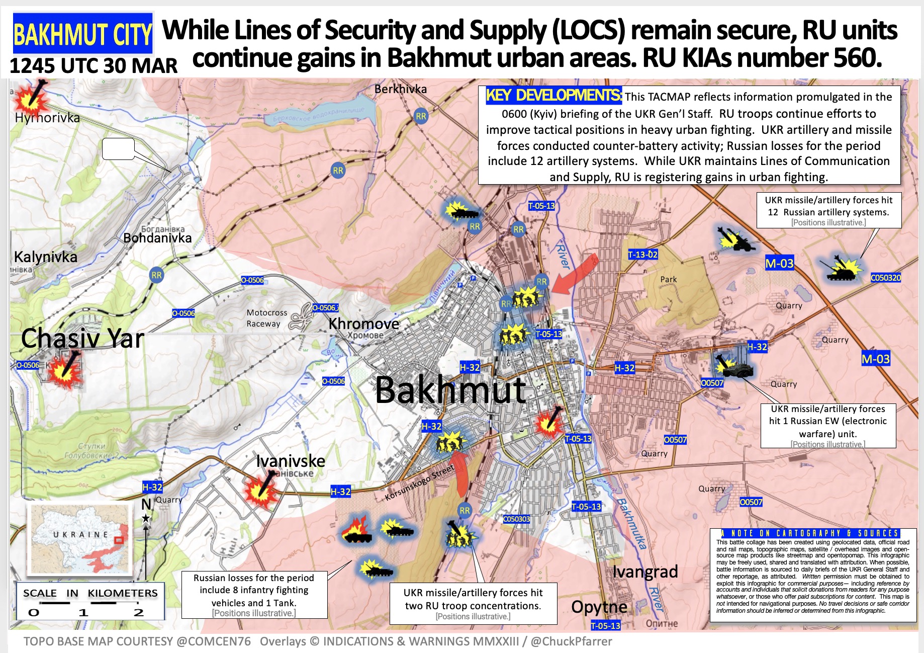 新‧二七部隊 軍事雜談 (New 27 Brigade)🇹🇼🇺🇦 on Twitter23/3/30. 巴赫穆特地區戰況,俄軍持續改進在城市戰的戰術位置,烏軍砲兵進行反砲兵活動,導致俄軍損失包括12門火砲系統,在烏軍保持戰線安全和支援(LOCS)的同時,俄軍在城市戰取得了進展