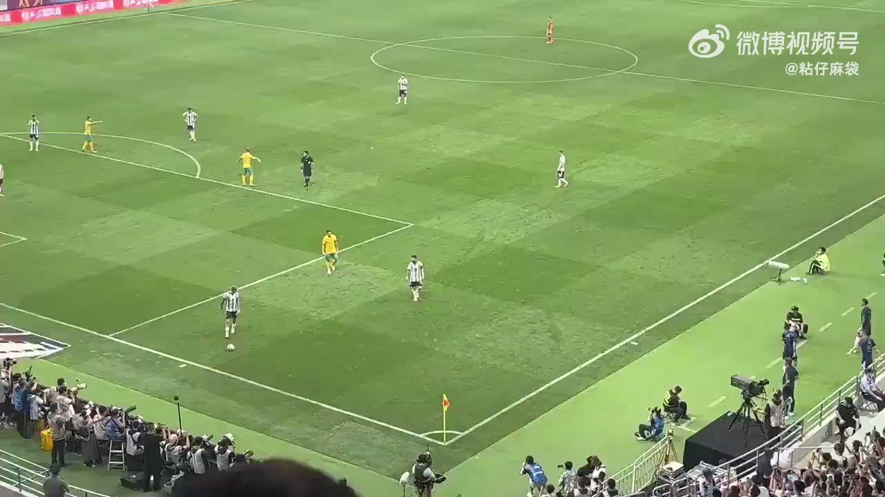 一名球迷闯入赛场与梅西拥抱并绕场,引发全场欢呼齐喊“牛逼”。