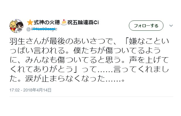 在冰演活動結束前,羽生對粉絲說「被說了很多很討厭的話,我想就像我們受傷一樣大家也覺得受傷了。謝謝你們幫我說話(言ってくれてありがとう)」