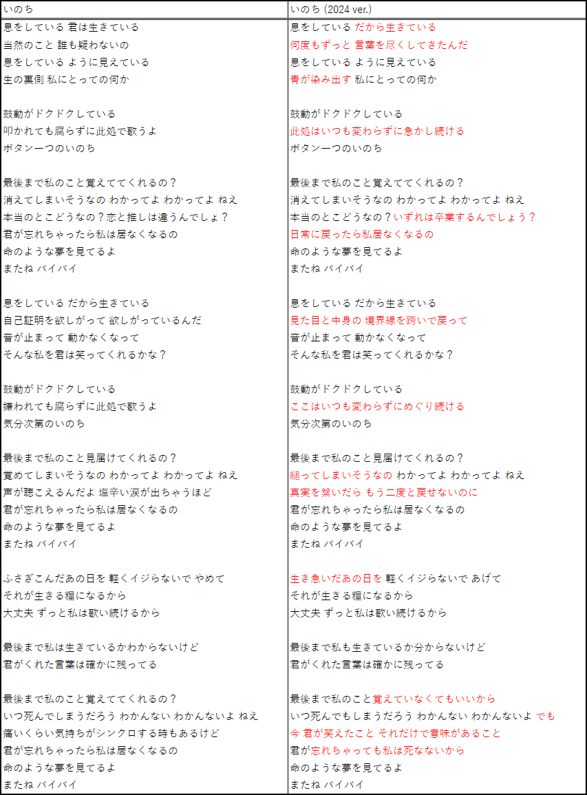 いのち 新舊版歌詞比較