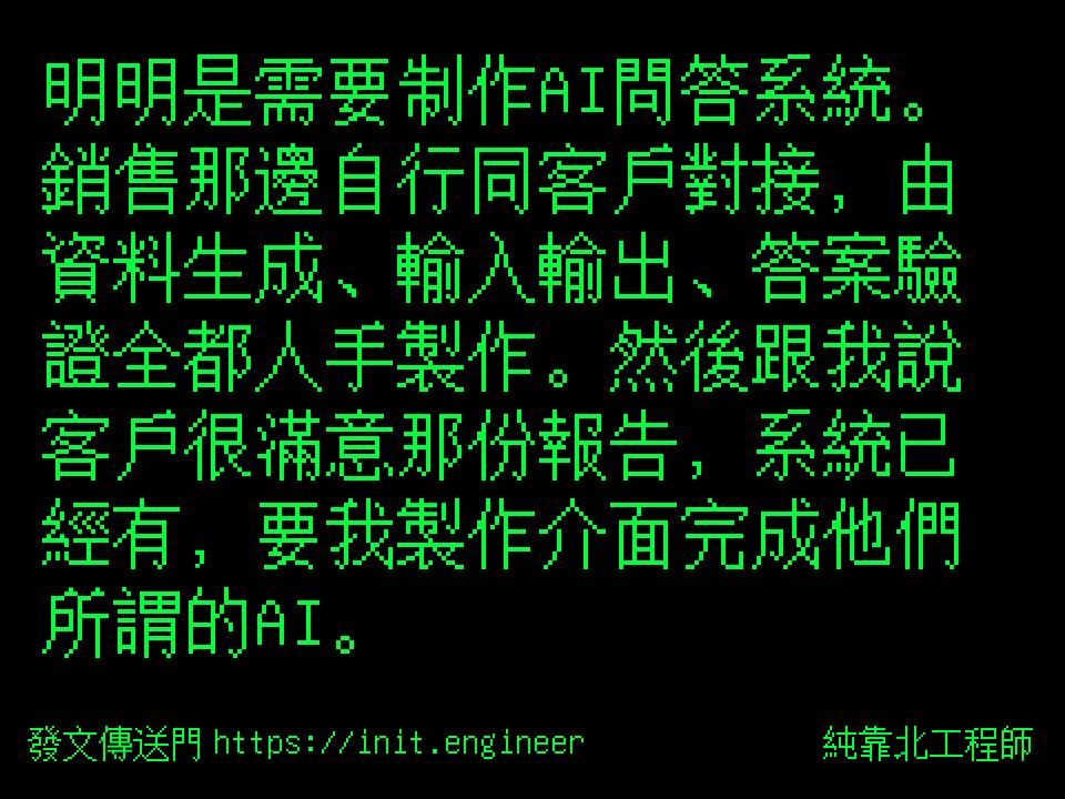 明明是需要制作AI問答系統。銷售那邊自行同客戶對接,由資料生成、輸入輸出、答案驗證全都人手製作。然後跟我說客戶很滿意那份報告,系統已經有,要我製作介面完成他們所謂的AI。